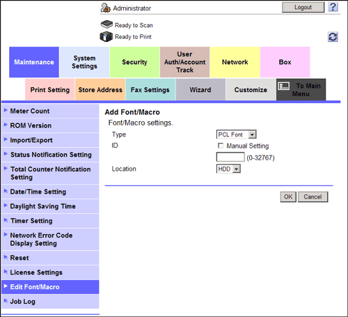 Add a font or macro to this machine. Also delete the registered font or macro.
