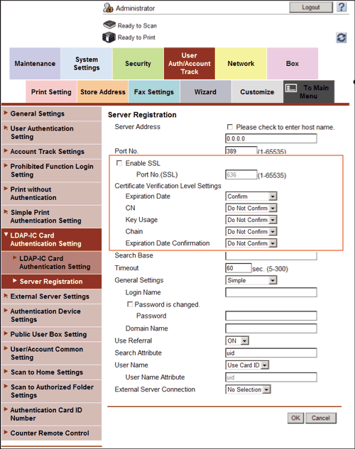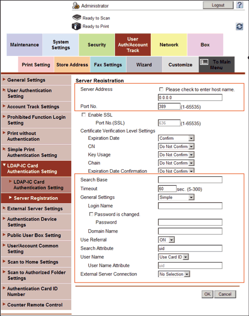 In the administrator mode, select [User Auth/Account Track] - [LDAP-IC Card Authentication Setting] - [Server Registration] - [Edit], then configure the following settings.