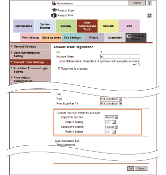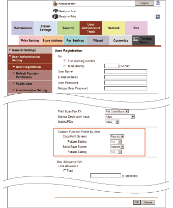 In the administrator mode, select [System Settings] - [Custom Function Profile User/Account], set [Custom Function Profile User/Account] to [Allow] (Default: [Restrict]).