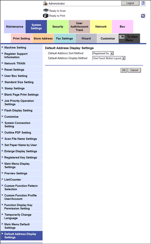[Default Address Display Method] | Select the button or list type to display destinations. [One-Touch Button Layout] is specified by default. |