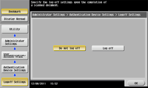 - Select whether to automatically log out when original scanning has been completed (default: [Do not log off]).