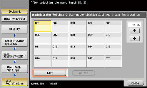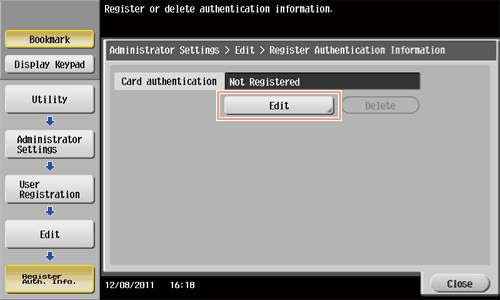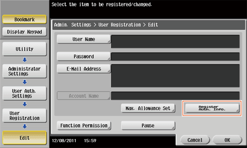 Tap [Utility] - [Administrator Settings] - [User Authentication/Account Track] - [User Authentication Settings] - [User Registration].