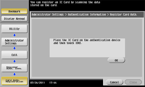 Pass or place the IC card over or on the authentication unit, then tap [OK].