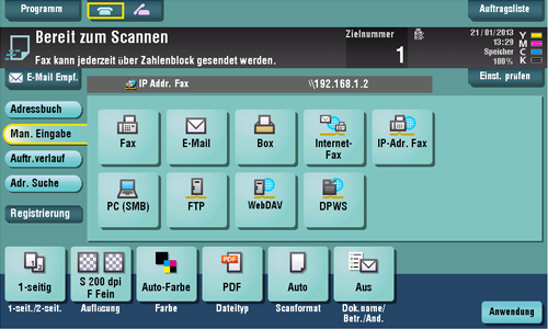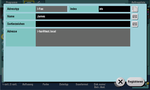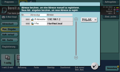 Nach Abschluss einer Faxübertragung an die manuell eingegebene Adresse tippen Sie auf [Adressbuch] und prüfen Sie, ob das Ziel registriert wurde.