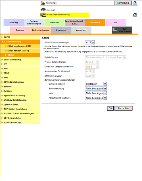 [S/MIME-Komm.-Einstellungen] | Wählen Sie [EIN] aus, um S/MIME zu verwenden. Zur Auswahl von [EIN] muss die E-Mail-Adresse des Zertifikats für dieses System der E-Mail-Adresse des Administrators entsprechen. [AUS] ist standardmäßig ausgewählt. |