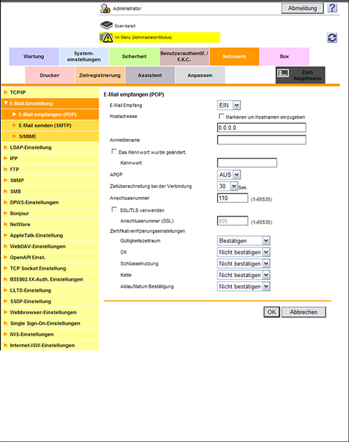 Definieren Sie die Einstellungen für POP über SSL und APOP entsprechend Ihrer Umgebung. Wählen Sie im Administratormodus [Netzwerk] - [E-Mail-Einstellung] - [E-Mail empfangen (POP)] aus und konfigurieren Sie die folgenden Einstellungen.