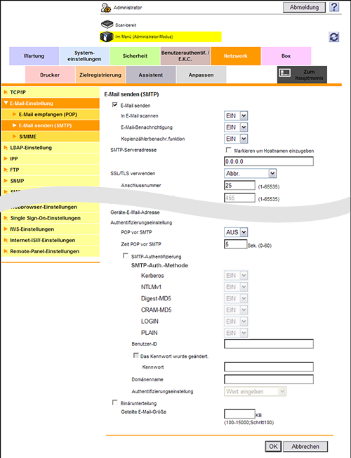 Wenn SMTP-Authentifizierung verwendet wird, werden bei der E-Mail-Übertragung die Benutzer-ID und das Kennwort von diesem System gesendet, um die Authentifizierung durchzuführen.