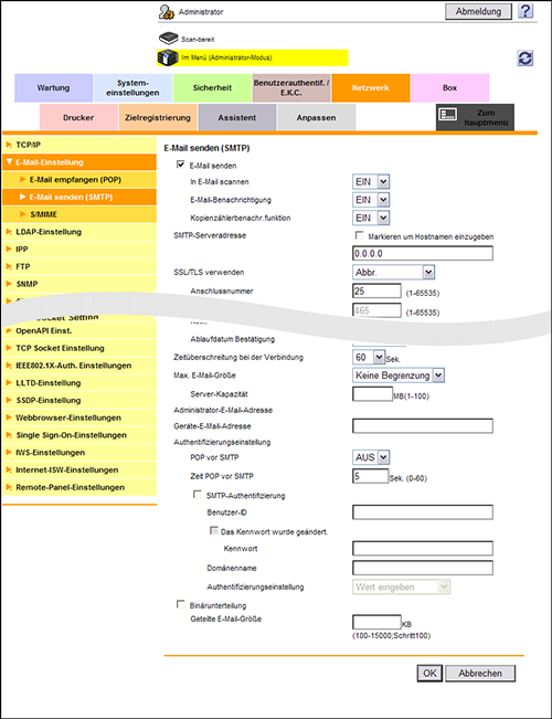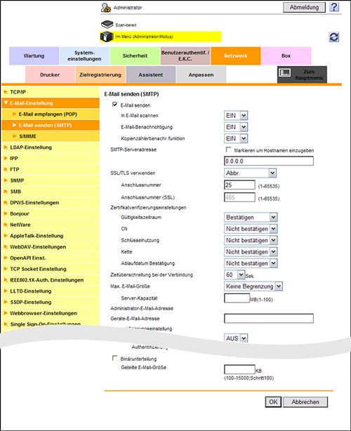 Wählen Sie im Administratormodus [Netzwerk] - [E-Mail-Einstellung] - [E-Mail senden (SMTP)] aus und konfigurieren Sie die folgenden Einstellungen.