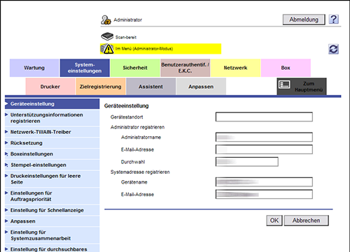 Wählen Sie im Administratormodus [Systemeinstellungen] - [Geräteeinstellung] und geben Sie die E-Mail-Adresse des Administrators dieses Systems unter [E-Mail-Adresse] ein (max. 128 Zeichen, außer Leerzeichen).