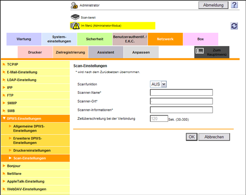 Wählen Sie im Administratormodus [Netzwerk] - [DPWS-Einstellungen] - [Scan-Einstellungen] und setzen Sie dann [Scanfunktion] auf [EIN] (Standard: [AUS]).