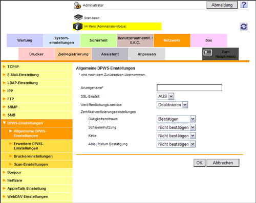 Wählen Sie im Administratormodus [Netzwerk] - [DPWS-Einstellungen] - [Allgemeine DPWS-Einstellungen] und setzen Sie dann [SSL-Einstell.] auf [EIN] (Standard: [AUS]).