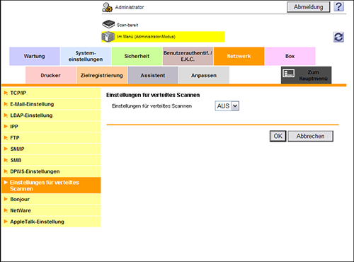 Wählen Sie im Administratormodus [Netzwerk] - [Einstellungen für verteiltes Scannen] und setzen Sie [Einstellungen für verteiltes Scannen] auf [EIN] (Standard: [AUS]).