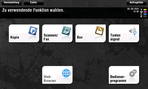 Sie können die häufig genutzten Funktionen und Direktaufrufe beliebig im Einstellungsspeicher (Kopierprogramm, Fax/Scan-Programm) im Hauptmenü anordnen.