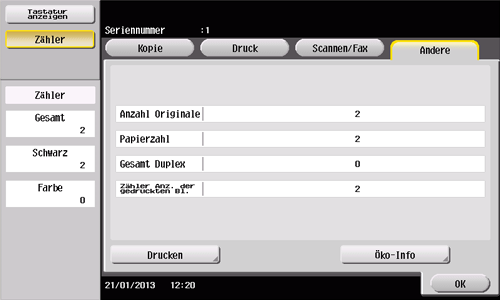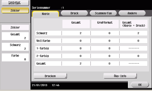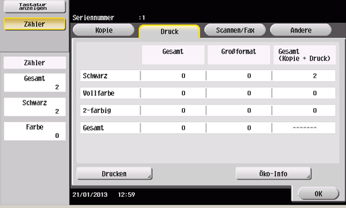 Prüfen Sie die Anzahl aller gescannten und gedruckten Vorlagenseiten, die Anzahl aller gedruckten Blätter, die Anzahl aller Seiten bei beidseitigem Druck und die Anzahl aller gedruckten Seiten unabhängig von Funktionen oder Farben.