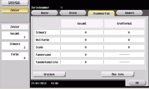 [Gesamt] | Gibt die Anzahl aller in sämtlichen Farbmodi kopierten Seiten an. | Gibt die Anzahl aller Seiten an, die in allen Farbmodi auf großformatigem Papier kopiert wurden. | - |