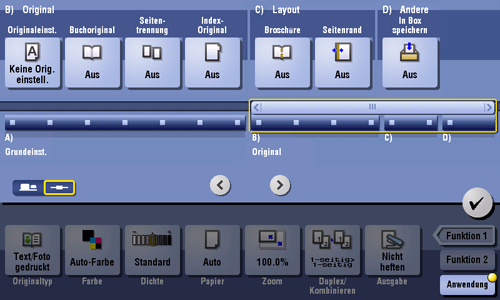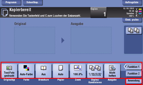 Wenn die Funktionstasteneinstellungen durch die Auswahl von [Funktionsanzeigetaste (Kopieren/ Drucken)] geändert wurden, werden die Funktionen, die nicht zu [Funktionstaste 1] bis [Funktionstaste 14] zugewiesen sind, unter [Anwendung] angezeigt.