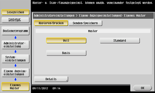 Tippen Sie auf [Bedienerprogramm] - [Administratoreinstellungen] - [Systemeinstellungen] - [Eigene Anzeigeeinstellungen] - [Eigenes Muster] und wählen Sie [Kopieren/Drucken] oder [Senden/Speichern].