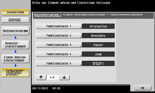 Zum Einrichten der Einstellungen wählen Sie [Bedienerprogramm] - [Administratoreinstellungen] - [Systemeinstellungen] - [Eigene Anzeigeeinstellungen] - [Funktionstasteneinstell. ändern].