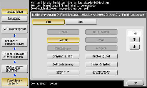 Wenn [Funktionsanzeigetaste (Kopieren/ Drucken)] angegeben ist, können Sie eine im Hauptbildschirm des Kopiermodus und im Druckbildschirm des Boxmodus anzuzeigende Funktionstaste ändern.
