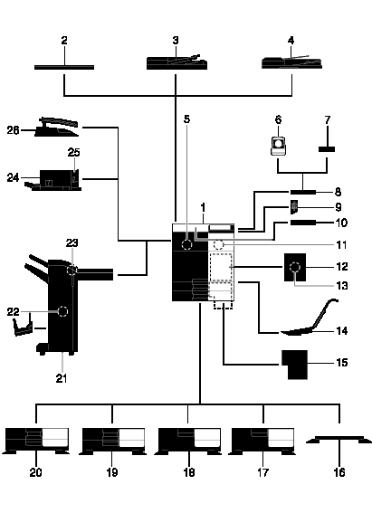 21 | Finisher FS-534 | Dient zum Sortieren, Gruppieren und Heften bedruckter Seiten vor der Ausgabe. Für die Installation des Finishers FS-534 muss der Unterschrank DK-510, die Papiereinzugseinheit PC-410, die Papiereinzugseinheit PC-110 oder die Papiereinzugseinheit PC-210 auf diesem System installiert sein. |