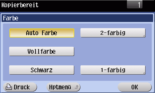 Es gibt fünf Farbmodi: [Auto Farbe] zum Kopieren anhand der Originalfarbe, [Vollfarbe], [2-farbig], [1-farbig] und [Schwarz].