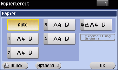 Das System wählt beim Erstellen einer Kopie automatisch Papier aus, das dem Format des erkannten Originals entspricht. Falls erforderlich, können Sie zum Erstellen einer Kopie einen vom Original abweichenden Papiertyp bzw. ein abweichendes Papierformat angeben.