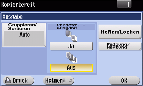 [Versetz.-Ausgabe] | Wählen Sie [Ja], wenn die Ausgabe nach Kopien oder nach Seiten sortiert werden soll. Wenn der Finisher oder die Zweifachablage JS-506 installiert ist, werden die Kopien bei der Ausgabe übereinander gestapelt, wobei einzelne Kopien- oder Seitensätze versetzt abgelegt werden, um sie voneinander zu trennen. Wenn kein Finisher oder keine Zweifachablage JS-506 installiert ist, werden die gedruckten Kopien kreuzweise sortiert ausgegeben, wenn die folgenden Bedingungen erfüllt sind.