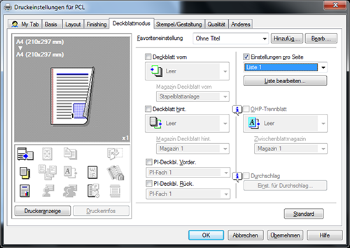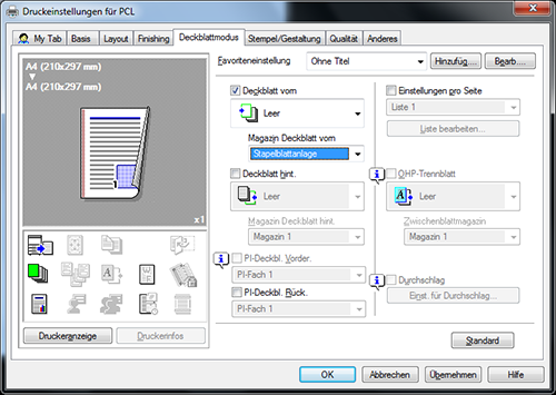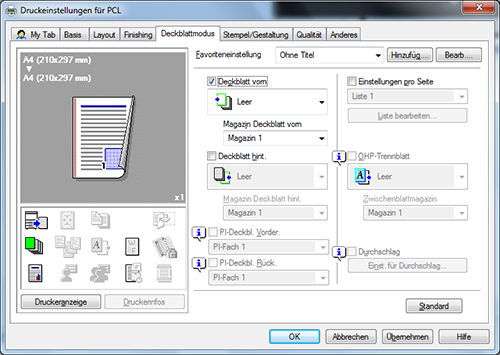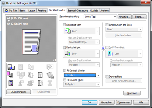 Wählen Sie unter [Deckblatt vorn] entweder [Leer] oder [Drucken] und unter [Magazin Deckblatt vorn] ein Papierfach aus.