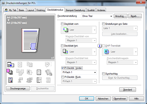 Um das Deckblatt auf einen anderen Papiertyp zu drucken, aktivieren Sie auf der Registerkarte [Deckblattmodus] das Kontrollkästchen [Deckblatt vorn].