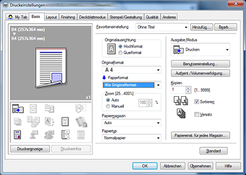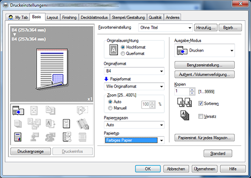 Wählen Sie auf der Registerkarte [Basis] unter [Papiermagazin] eine andere Einstellung als [Auto] aus.