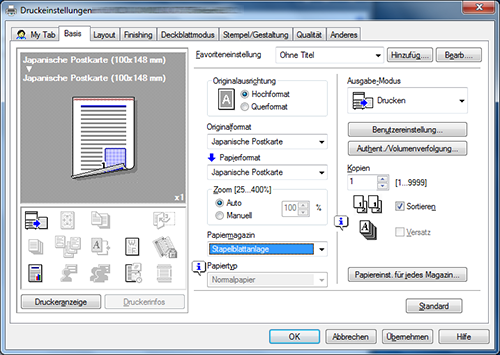 Wählen Sie auf der Registerkarte [Basis] unter [Originalformat] entweder [Umschlag] oder [Postkarte] aus.