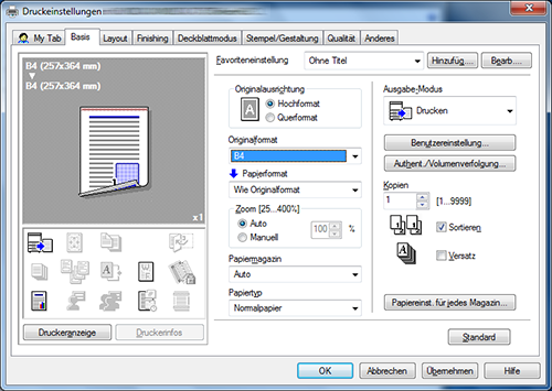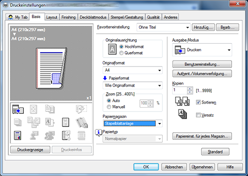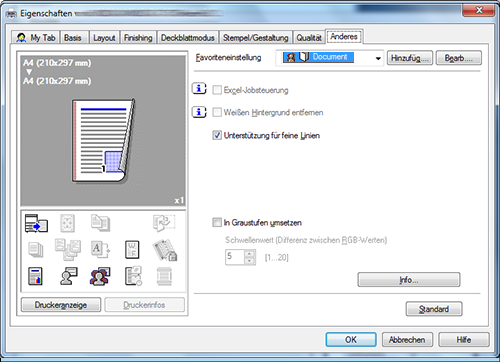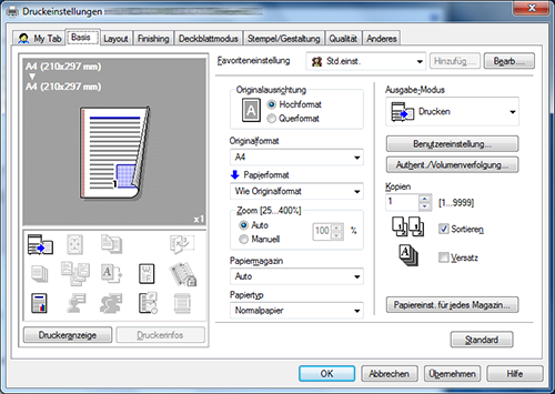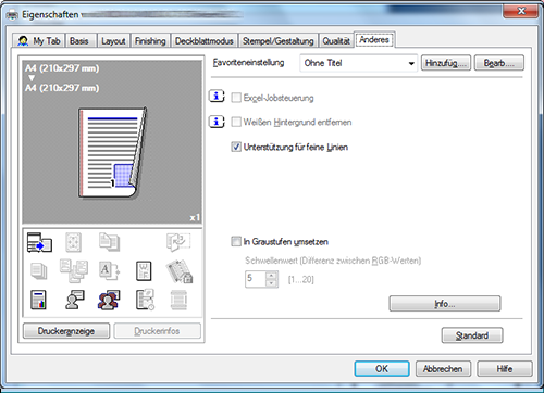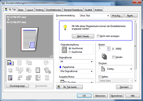 A15. Ja. Sie können das Fenster aus dem Eigenschaftenfenster des Druckertreibers anpassen, indem Sie häufig genutzte Funktionen auf [My Tab] registrieren oder indem Sie für die einzelnen Registerkarten Einstellungen als Favoriten registrieren, um diese schnell aktivieren zu können.