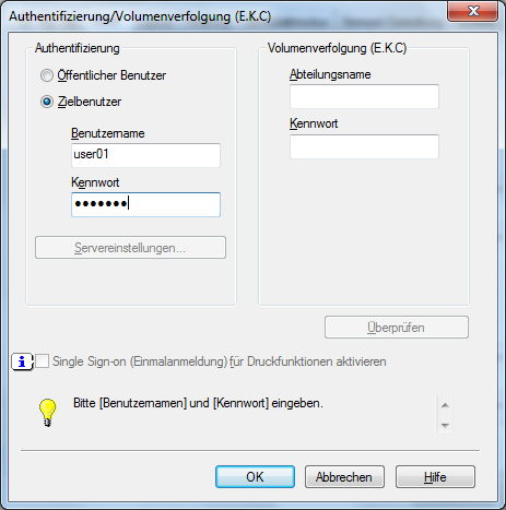 Wählen Sie [Zielbenutzer] aus und geben Sie den auf dem System registrierten Benutzernamen und das zugehörige Kennwort in [Benutzername] und [Kennwort] ein. Klicken Sie dann auf [OK].