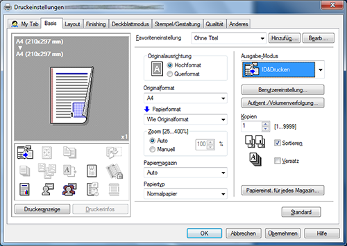 Wenn Sie in den Anfangswerten Schwarzweißdruck und 2-seitigem Druck festlegen, können Sie Toner und Papier sparen.