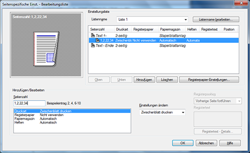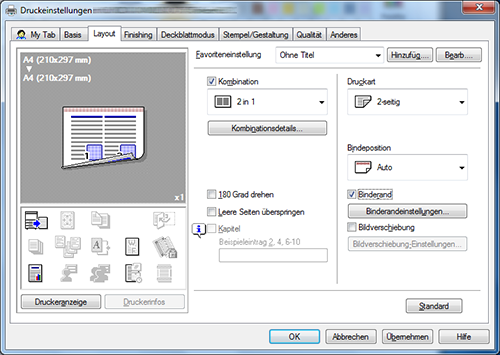 Um Kapitelzwischenblätter auf einen anderen Papiertyp zu drucken, aktivieren Sie auf der Registerkarte [Deckblattmodus] das Kontrollkästchen [Einstellungen pro Seite].