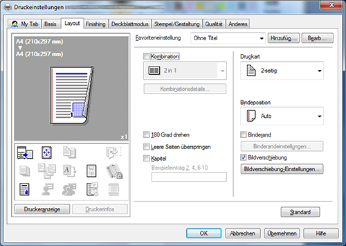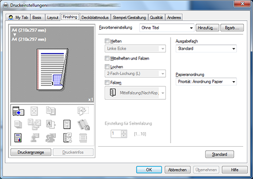 Aktivieren Sie auf der Registerkarte [Finishing] das Kontrollkästchen für die gewünschte Art der Ausgabe. Wenn Sie das Kontrollkästchen [Heften], [Lochen] oder [Falzen] aktiviert haben, geben Sie die Anzahl, die Positionen und die anderen erforderlichen Einstellungen an.