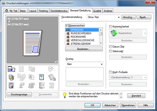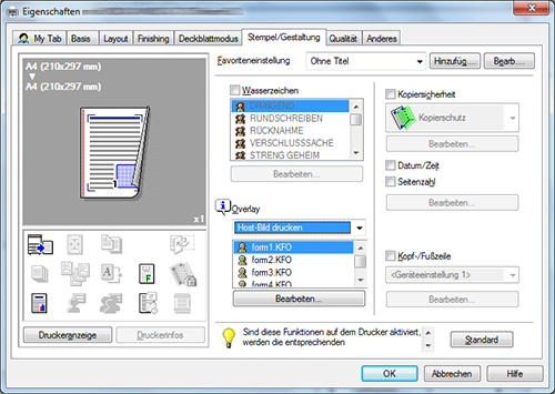 Außerdem steht eine Overlayfunktion zur Verfügung, die es erlaubt, über eine Ausgabe einer auf dem Computer gespeicherten Datei zu drucken.