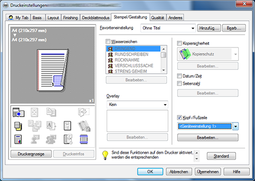 Aktivieren Sie auf der Registerkarte [Stempel/Gestaltung] das Kontrollkästchen [Wasserzeichen] und wählen Sie dann ein Wasserzeichen aus.