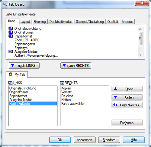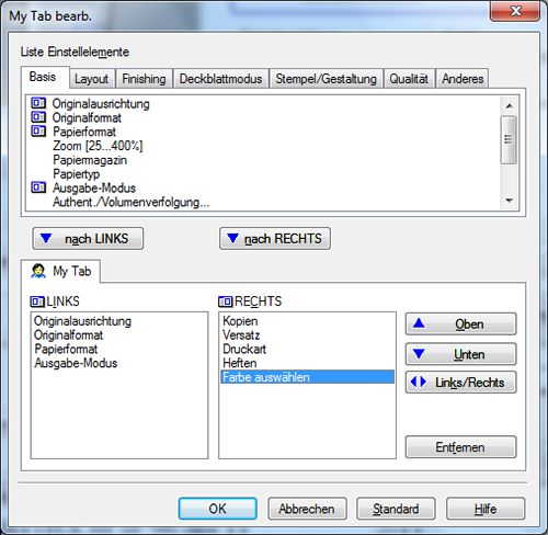 Um Funktionen auf [My Tab] zu registrieren, wählen Sie die gewünschten Funktionen aus [Liste Einstellelemente] aus und klicken Sie dann auf [nach LINKS] oder [nach RECHTS].