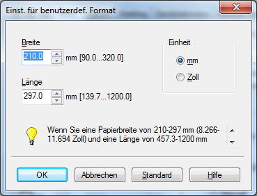 Geben Sie in [Breite] und [Länge] die Breite und die Länge des zu bedruckenden Papiers ein und klicken Sie dann auf [OK].