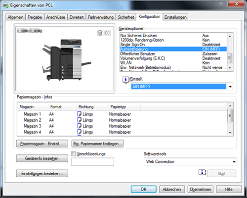Wählen Sie auf der Registerkarte [Konfiguration] unter [Geräteoptionen] die Option [Authentifizierung] aus und wählen Sie dann unter [Einstell.] den Authentifizierungsstatus aus.