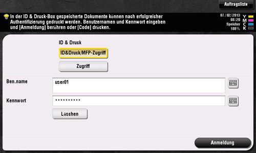 Wählen Sie [ID&Druck/MFP-Zugriff] aus, geben Sie Ihren Benutzernamen und Ihr Kennwort ein und tippen Sie dann auf [Anmeldung].