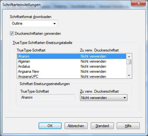 Sie können verstümmelte Zeichen auch vermeiden, indem Sie das Kontrollkästchen [Druckerschriftarten verwenden] abwählen.