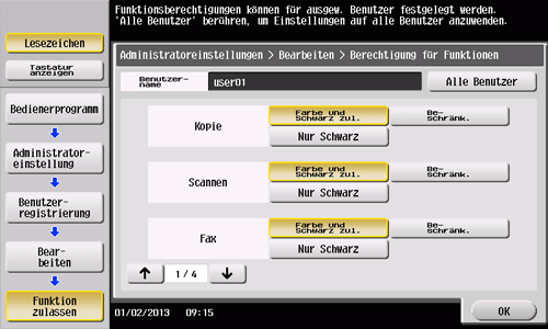 Tippen Sie auf [Maximal erlaubte Einstellungen] und auf [Farbe] oder [Schwarz] und geben Sie über die Tastatur die maximal zulässige Anzahl Farb-/Schwarzweißoriginale an, die der Benutzer ausdrucken darf.