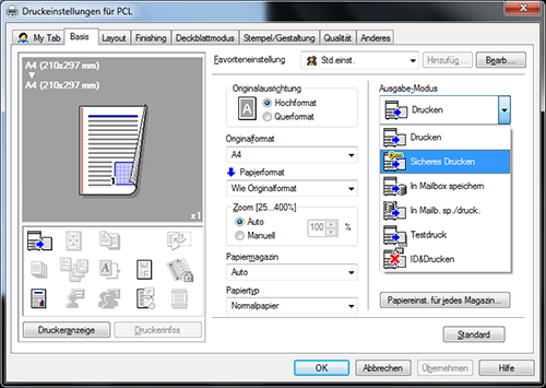Wählen Sie auf der Registerkarte [Basis] unter [Ausgabe-Modus] die Option [Sicheres Drucken] aus.