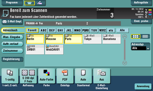 Sie können mehrere Kurzwahlziele aus dem Adressbuch auswählen. Tippen Sie auf [Zielnummer], um die Sendezielliste anzuzeigen und die angegebenen Ziele zu überprüfen oder zu löschen.