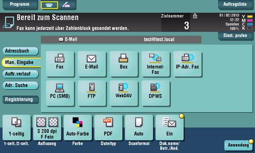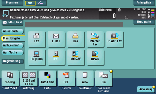 Tippen Sie auf [Scannen/Fax] und wählen Sie in [Man. Eingabe] einen Zieltyp aus.