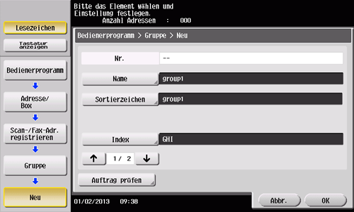 [Index] | Wählen Sie einen Suchtext aus. Gruppenziele werden im Hauptbildschirm des Scan-/Faxmodus nach dem hier angegebenen Index sortiert angezeigt. Geben Sie für eine häufig verwendete Gruppe die Indexzeichen ein und wählen Sie gleichzeitig die Option [Favoriten] aus. Dadurch können Sie das Ziel später viel einfacher finden. |