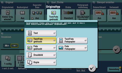 Tippen Sie auf [Anwendung], um [Originaltyp] auszuwählen, und wählen Sie dann eine Option entsprechend der Qualität des zu scannenden Originals aus.