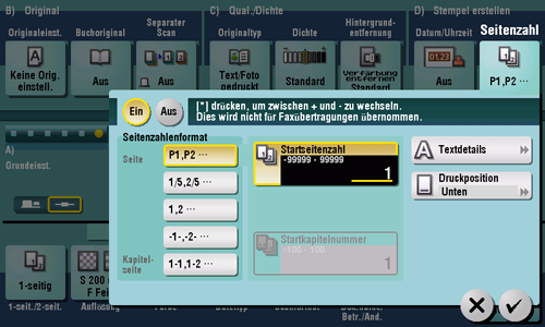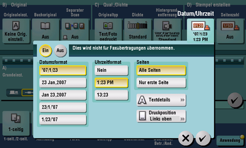 Tippen Sie auf [Ein], legen Sie Werte für [Datumsformat], [Uhrzeitformat] und [Seiten] fest und tippen Sie dann auf [OK].